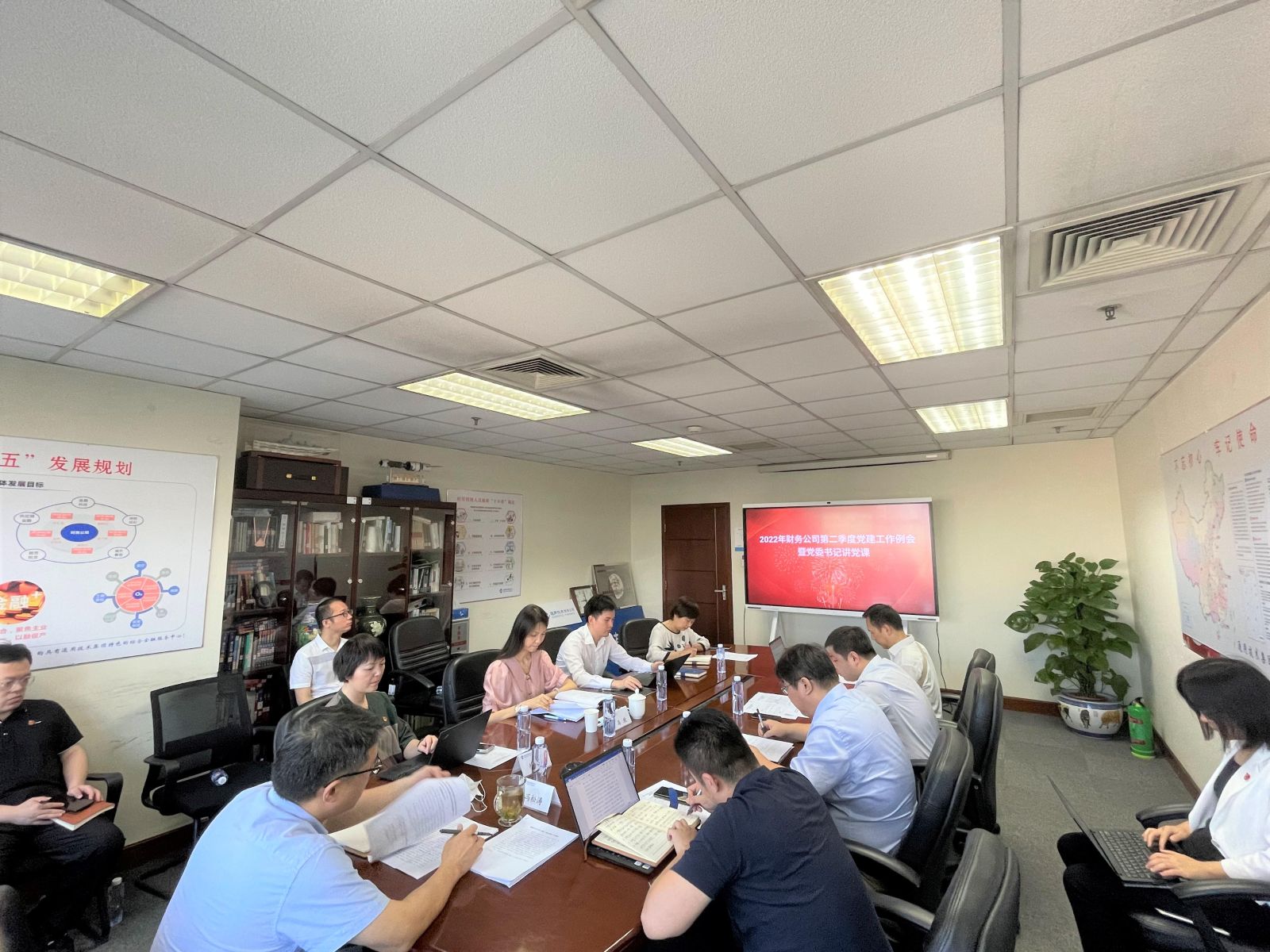 7月15日,通用技术财务公司在本单位第一会议室召开2022年第二季度党建工作例会暨组织党委书记讲党课。公司党委书记冯松涛,纪委书记、副总经理祝旭明,党委委员、副总经理徐艺参加会议,集团党群工作部马欣同志列席指导会议,各党支部书记和委员、各部门负责人及党群工作部全体员工在现场参会,其他党员、群众通过视频参会。