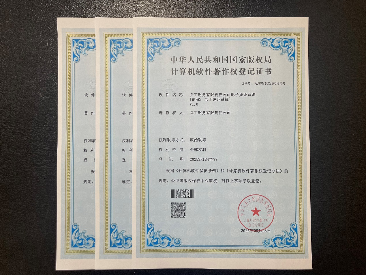2025年10月,兵工财务公司成功获得国家版权局颁发的三项计算机软件著作权登记证书,涵盖电子凭证系统、司库银行账户统一管理系统及司库金融产品投资管理系统,至此,公司累计拥有的计算机软件著作权数量已达29项。下一步,公司将深入贯彻落实习近平总书记关于知识产权工作的重要指示精神,严格执行集团公司知识产权相关部署,加强信息科技自主研发能力建设,推动信息科技高水平自立自强,持续完善知识产权管理体系,进一步提升公司核心竞争力,为一流精品财务公司建设注入强劲动力。