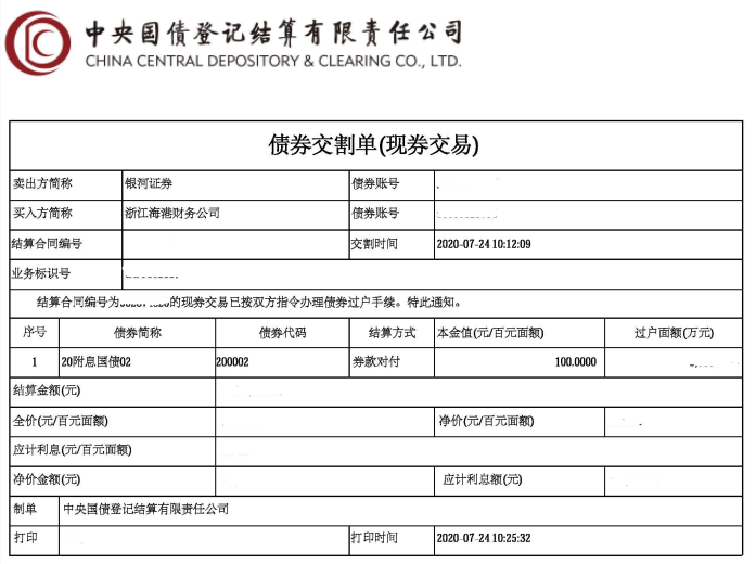 2020年7月24日,浙江海港集团财务有限公司首笔现券交易成功交割。标志着公司债券业务从一级市场拓展至二级市场。
