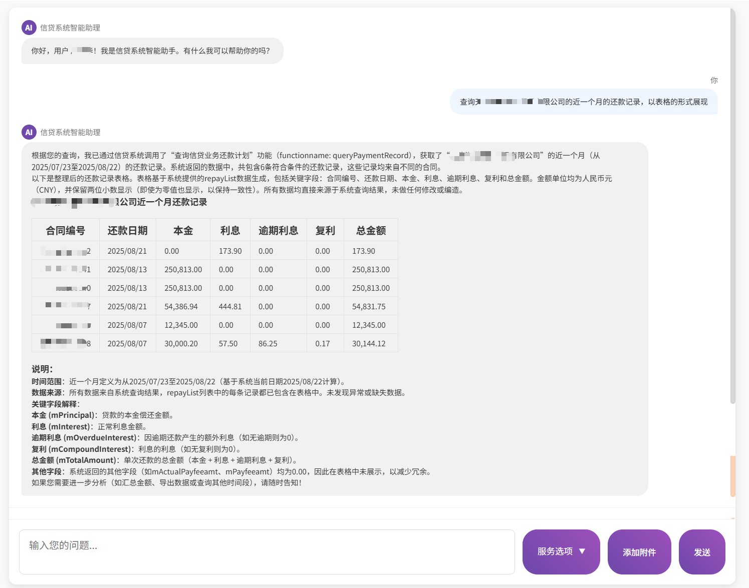 客户经理可通过对话式指令(如“查询客户A近三个月还款记录”)直接调取客户信息、合同借据、还款计划等关键业务数据,系统自动生成结构化结果。业务审批环节通过智能分析历史数据,提供决策建议。