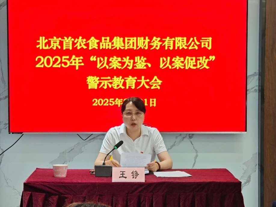 按照深入贯彻中央八项规定精神学习教育的部署要求,8月21日首农食品财务公司召开2025年“以案为鉴、以案促改”警示教育大会。公司领导班子成员、中层正副职干部以及全体干部职工参会。财务公司党支部书记、董事、总经理王铮主持会议。