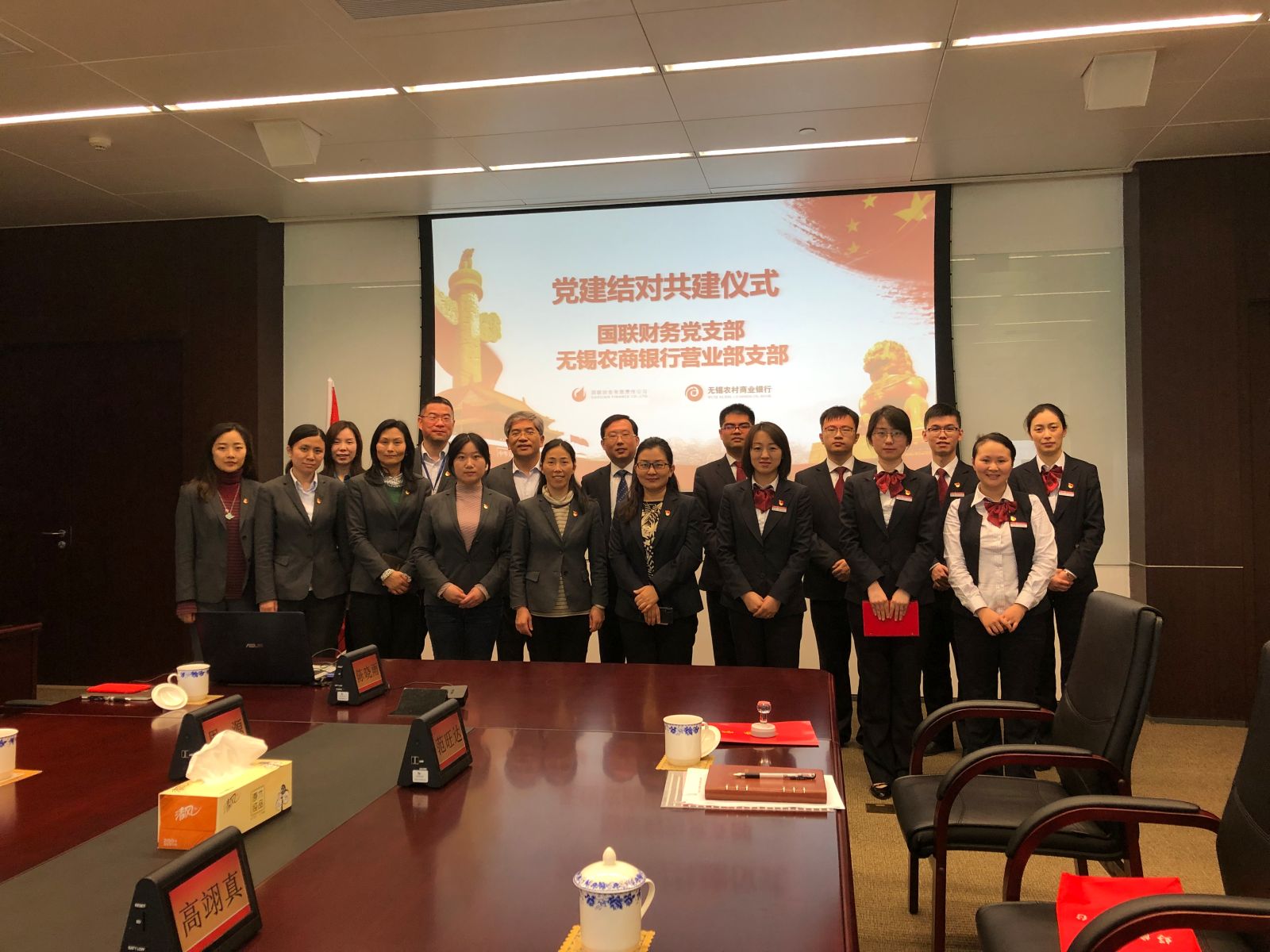为深入贯彻党的十九大及全国国有企业党建工作会议精神,推动全面从严治党向基层延伸,进一步强化党的领导,充分发挥基层党组织政治核心作用、战斗堡垒作用,4月3日中午,国联财务党支部与无锡农商银行营业部支部举行了结对共建签约仪式。国联财务党支部书记、总经理刘清欣,无锡农商行营业部支部书记、总经理吴国荣,以及双方党员代表共17人出席了本次活动。