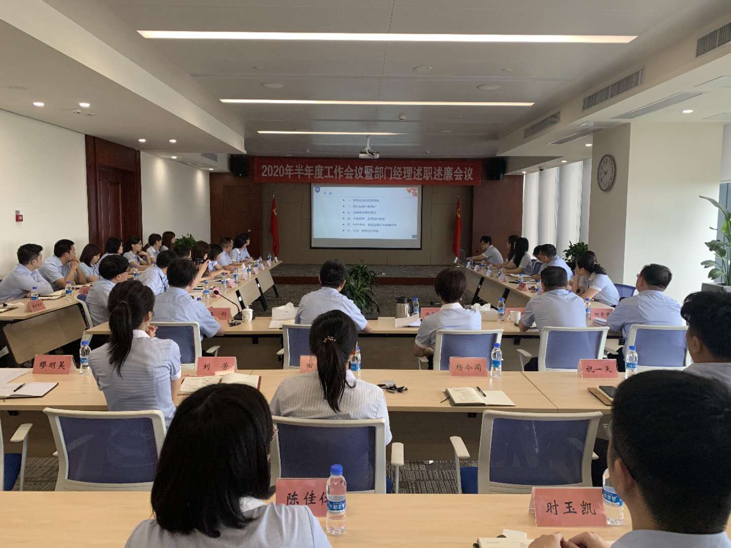 8月7日,江苏交控财务公司召开2020年半年度工作会议暨部门经理述职述廉会议,传达学习江苏交控系统聚焦夺取双胜利奋力当好先行军大会暨2020年半年度工作会议精神,总结回顾公司上半年工作,表彰先进,研究分析存在的问题,安排布置下半年工作。公司党支部书记、董事长陈凤艳出席会议并讲话。会议由公司总经理、党支部副书记杨水明主持。