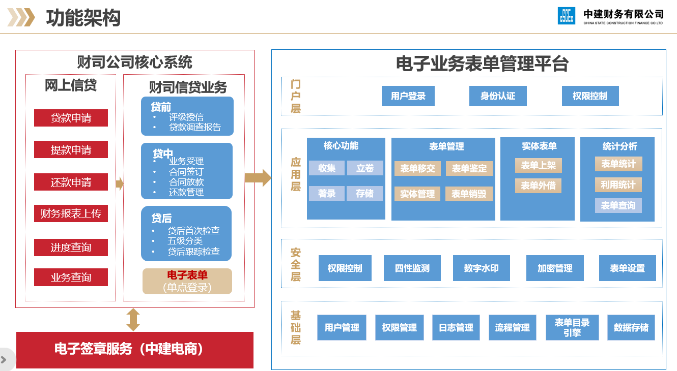 基于电子表单管理平台,为实现信贷业务完全无纸化,中建财务与集团内部电子印章服务商系统集成,以电子印章替代线下用印,对业务产生的各类型电子表单、合同协议,在审批通过后调取具有法律效力的电子印章,并将具有法律效力的文档实时回传电子业务档案系统进行归档。含有电子印章技术的办公自动化系统可以大大减少重复劳动,不仅解决了传统办公的效率低下和纸张浪费状况,它可以使各个部门、各个环节的单独处理工作串联起来,同时也能处理流程上多环节的任务,有助于业务办理效率的提升。