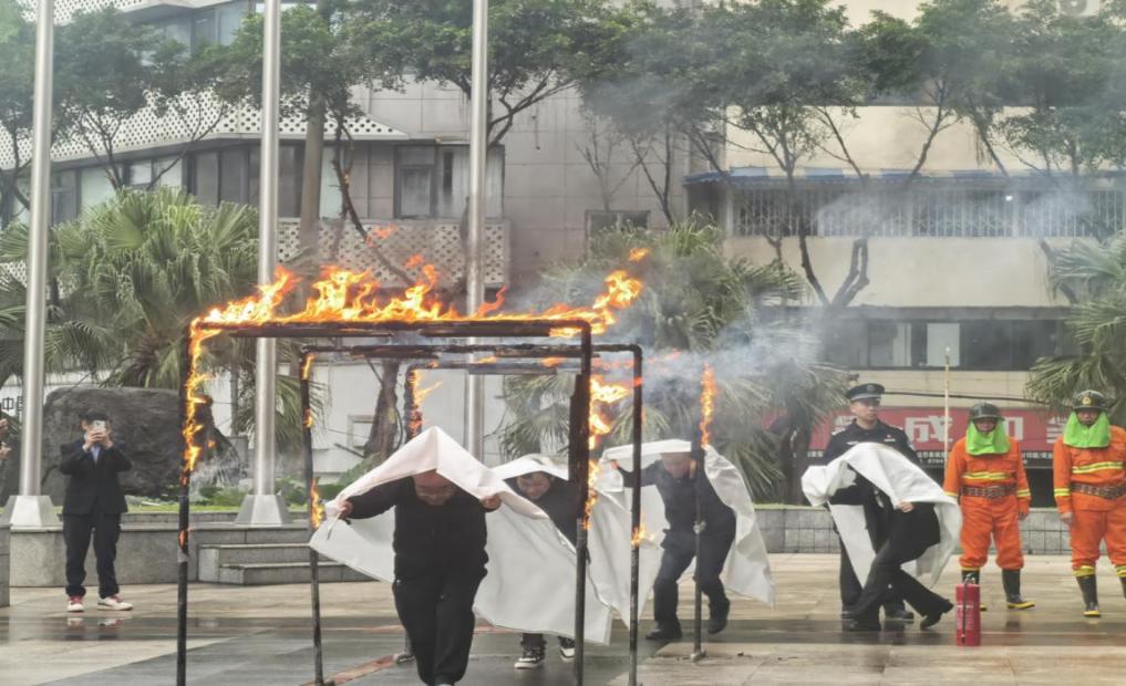 随后,演练进入核心实战阶段。在教官的专业指导下,全体员工依次参与了灭火器实操与钻火圈逃生体验两大项目。在灭火器实操区,面对熊熊燃烧的火盆,员工们沉着冷静,按照“提、拔、握、压”的操作要领,迅速使用干粉灭火器对准火焰根部进行喷射,成功扑灭明火。紧随其后的钻火圈逃生体验将现场氛围推向高潮。该项目模拟了火苗四起、浓烟弥漫环境下的低姿避险逃生场景。在火光与浓烟中,职工们身披防火毯,压低身体,快速有序地穿越由火门构成的烈焰通道。