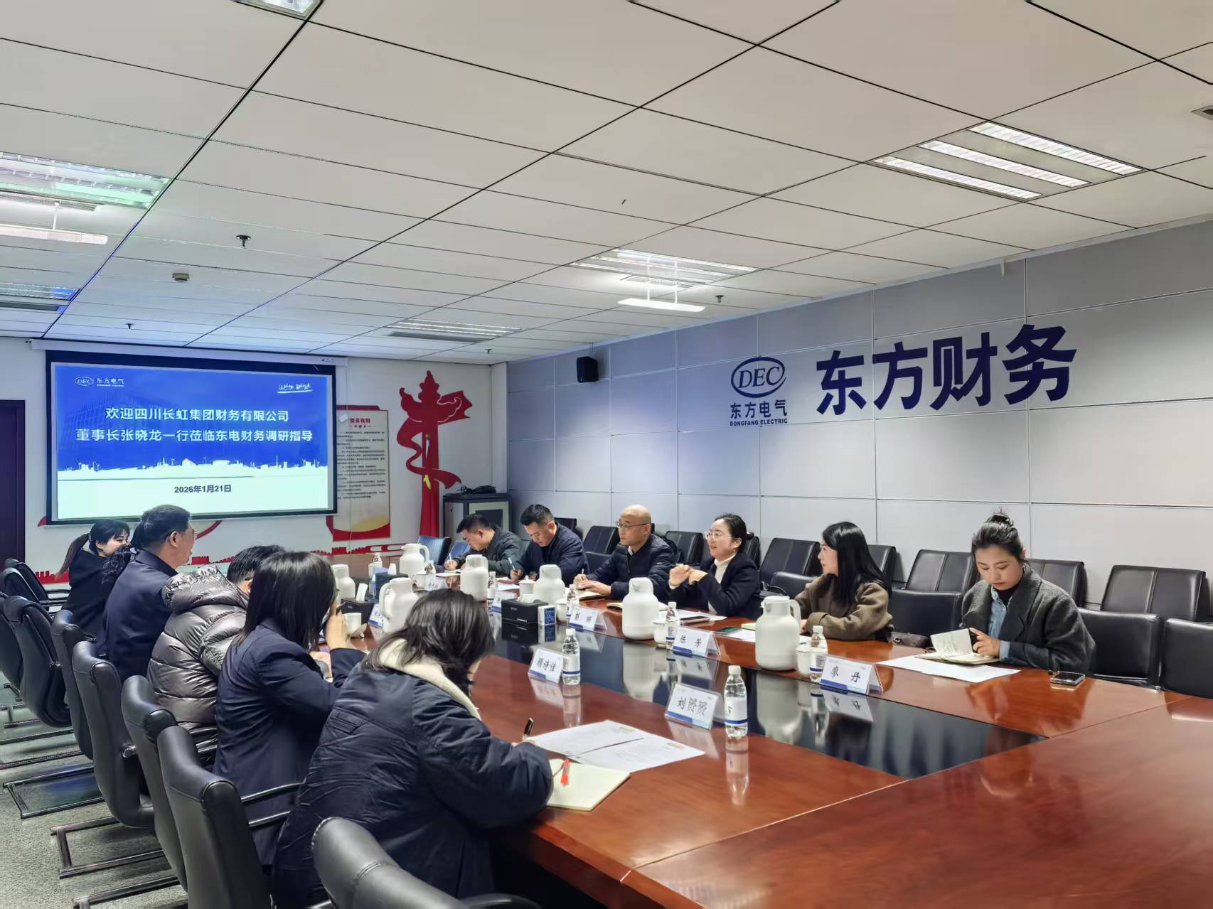 交流中,张晓龙副总一行详细了解了东方电气司库建设和运营管理等情况,并介绍了长虹集团司库建设有关情况。双方还就司库和财务公司管理等细节进行了深入讨论。