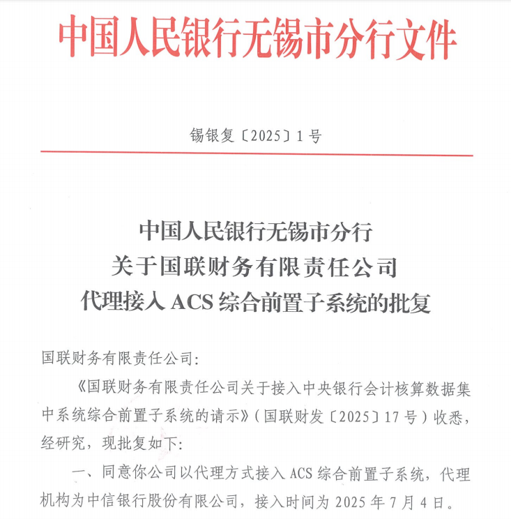 为提升工作质效与信息化应用水平,国联财务有限责任公司于6月19日获批以代理模式接入ACS综合前置子系统,并于7月4日成功上线运行,成为无锡首家以代理模式接入的地方法人金融机构。