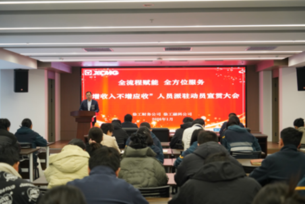 1月31日上午,徐工财务公司、融科公司联合召开全流程赋能,全方位服务——驻厂人员动员大会。会议紧扣集团2026年核心目标,正式启动人员派驻专项工作,凝聚全员共识,为实现集团战略目标筑牢坚实保障。徐工财务公司、徐工融科公司全体员工参会。