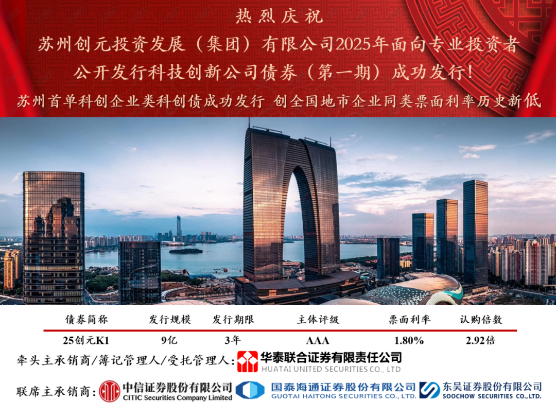科创债是面向科技创新领域企业发行、募集资金专项支持科技创新发展的公司债券,专为科技企业提供低成本、长期资金支持,与企业发展需求高度契合。本次创元集团发行的科创债券是苏州首单科创企业类科创债,债券期限3年,合计发行规模9亿元,票面利率1.80%,发行利率创全国地市企业同类公司债发行票面利率历史新低,全场认购倍数2.92倍,充分彰显了资本市场对创元集团创新发展前景和整体信用的高度认可。
