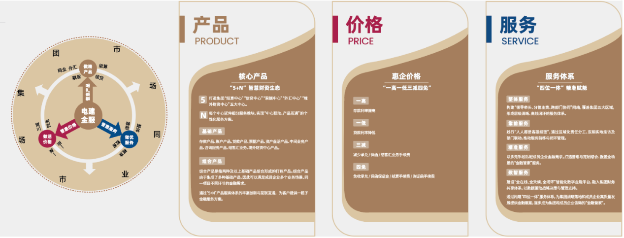 “电建金服”品牌的核心竞争力,源于公司在价格、产品、服务上的持续突破。价格方面,推出“一高一低三减四免”普惠定价体系,即:提高存款利率、降低贷款利率,减免承兑、保函、结售汇三类手续费,免除承兑保证金、保函保证金、结算手续费和询证函手续费。通过“双挂钩”动态基础定价、战略性新兴产业专项定价、重点领域个性化定价,最大限度让利成员企业。截至2025年8月末,已累计为集团和成员企业综合创效约9.06亿元。