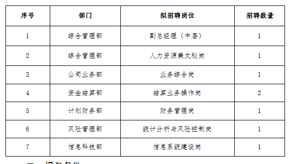 应聘者应符合申报岗位的应聘条件,具体应聘条件及岗位职责见《中化工程集团财务有限公司岗位职责与任职条件说明书》(附件1)。