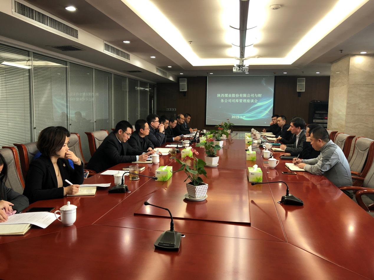 2019年1月7日下午,陕西煤业股份有限公司总会计师王晓刚、副总会计师段荣国,财务部副经理杨娟娟、朱炜、主任谭速刚及部门相关人员海静、张萌一行到财务公司进行座谈,公司董事长邓晓博、总经理李盈斌,副总经理刘旭春,首席信息官刘洪宇及相关部门负责人参加了座谈会。此次座谈主要对关联交易、存贷款比例、票据池优化、系统的升级改造、司库工作等展开了深入交流。
