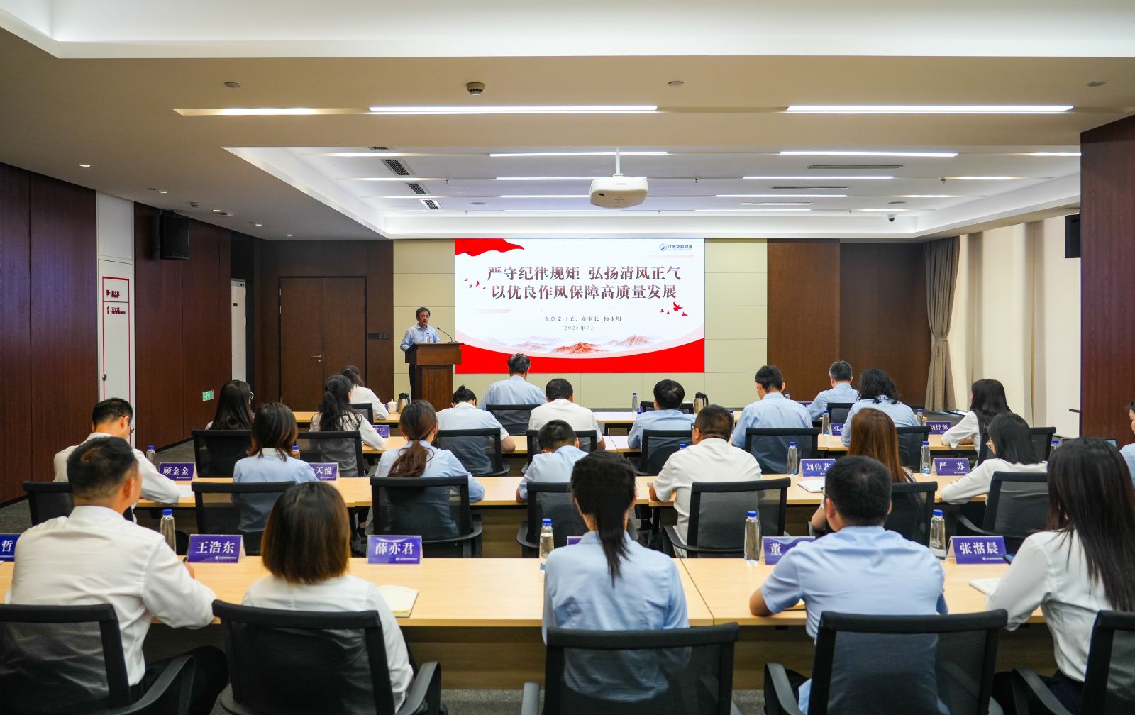 7月8日,为深入学习贯彻习近平总书记关于加强党的作风建设的重要论述和中央八项规定及其实施细则精神,不断推进深入贯彻中央八项规定精神学习教育走深走实,江苏交控财务公司党总支书记、董事长杨水明以《严守纪律规矩 弘扬清风正气 以优良作风保障高质量发展》为题讲授学习教育专题党课。