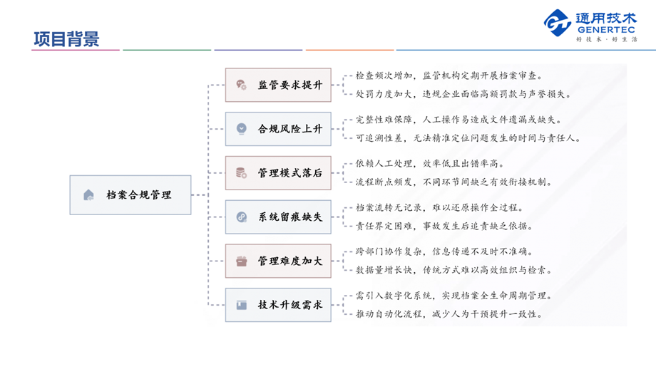 随着财务公司信贷业务规模的持续攀升,纸质档案堆积如山,传统人工管理模式已难以应对海量信贷档案的处理需求,一系列痛点日益凸显。一是监管要求越来越严。监管机构检查频次持续增加,处罚力度不断加大,违规企业将面临高额罚款与声誉损失的双重风险。但人工整理档案难免完整性不足,一旦问题发生,时间与责任人往往难以精准定位;二是协同效率低。信贷档案从客户经理整理到档案员归档,流程多、流转慢,交接靠签字、查询靠翻箱、跨部门协作复杂,使得档案流转无记录,数据检索效率低下。三是重复劳动耗时耗力。公司新核心系统已经上线,业务运行越发高效,但信贷档案管理仍停留在手工台账阶段。客户经理在系统里录过的数据,档案员归档时又要手工录一遍,重复劳动占据了大量时间精力。