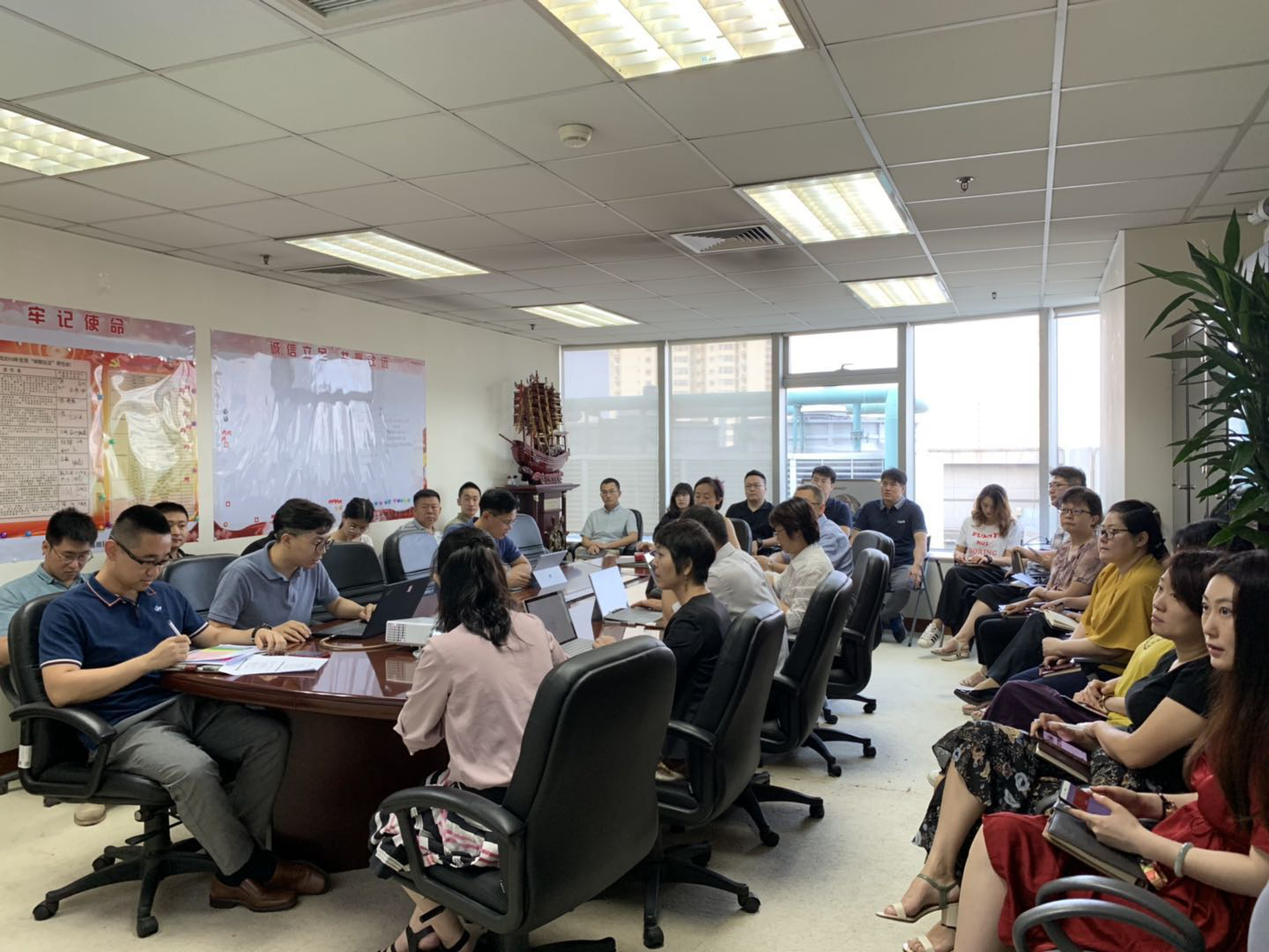 2019年7月8日,通用技术财务公司2019年上半年经营调度会在公司第一会议室召开,会议由卿虹董事长主持,公司领导班子成员及全体员工参加会议。根据议程安排,会议先后听取了金融市场部、计划财务部、综合管理部专题工作情况汇报。