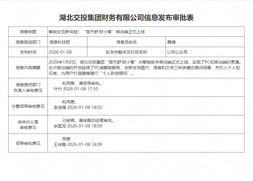 1月8日,湖北交投集团“楚天舒·财小智”AI智能助手移动端正式上线,实现了PC和移动端的贯通。此次移动端的开发延续了PC端智能服务,支持图片、语音和文字等多模态提问场景,并引入个人知识库,为用户打造随身随行的“个人财资顾问”。