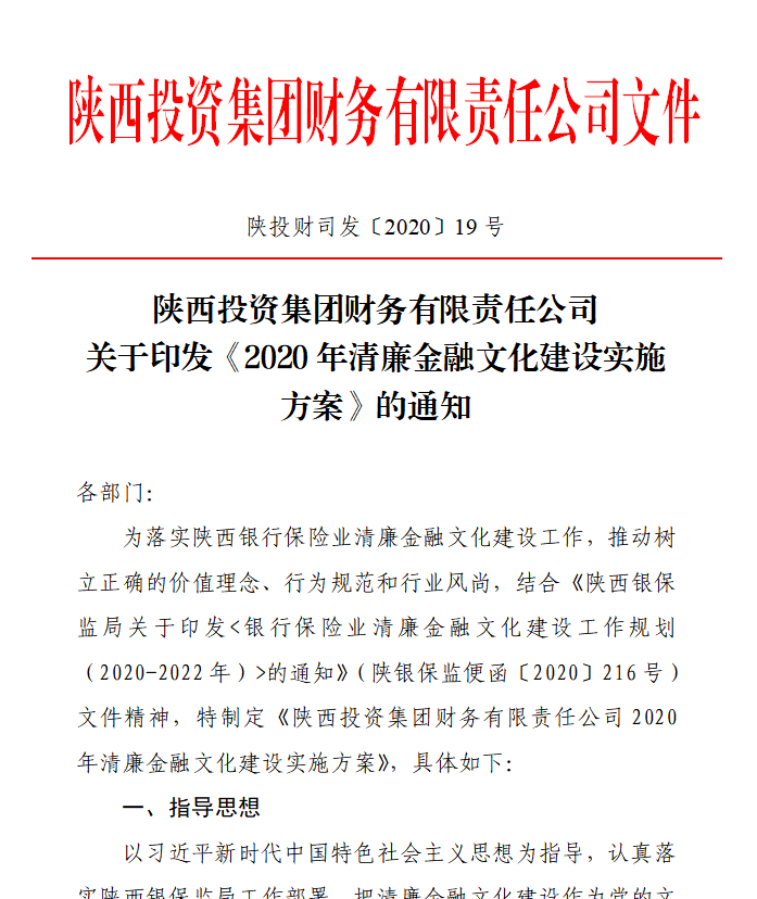 为贯彻落实《陕西银保监局关于印发<银行保险业清廉金融文化建设工作规划(2020-2022年)>的通知》(陕银保监便函〔2020〕216号)文件精神,陕投财司积极谋划,认真落实监管要求,制定《陕西投资集团财务有限责任公司清廉金融文化建设工作规划(2020-2022年)》,扎实推进清廉金融文化建设工作落地。