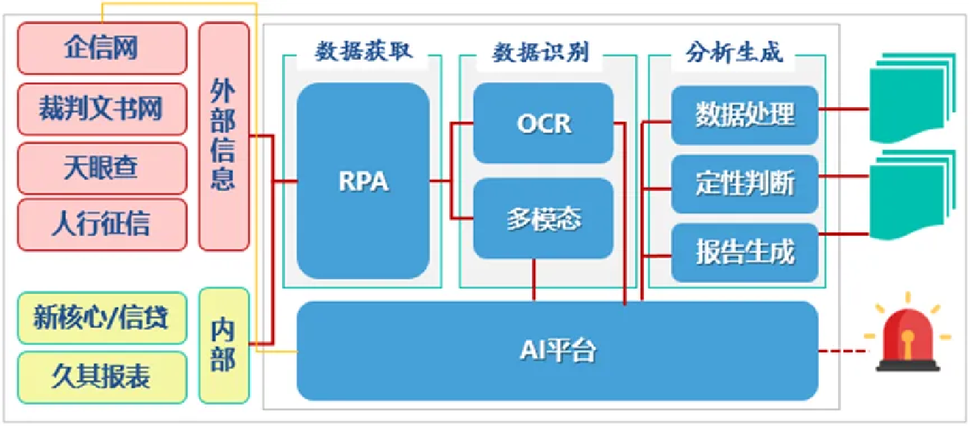 作为中化财务公司首个人工智能与业务系统融合的智能化应用项目,该系统依托AI平台,综合运用RPA、OCR、多模态识别和数据分析等技术,实现了内外部数据的自动采集与整合,智能数据分析与报告生成,进而进行贷后风险监控与预警,显著提升了公司贷后业务合规性与风控水平,同时也节约了客户经理信息收集和报告编写的时间。