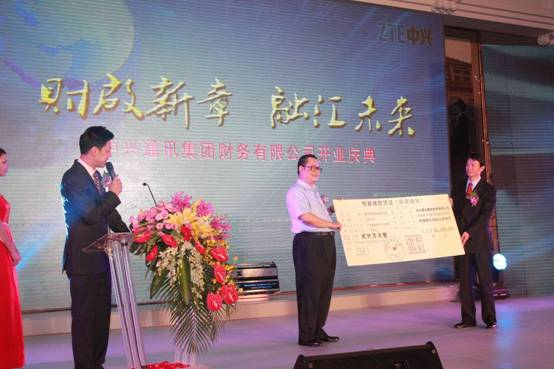 深圳银监局非银处处长秦辉首先宣读了开业批复并颁发了金融许可证,随后,陈应春副市长致辞并代表深圳市政府颁发了“深圳金融发展专项资金”支票。仪式结 尾,财务公司副董事长石春茂代表公司与国家开发银行等五家中资银行代表共同签署了战略合作协议,全面开启了中兴通讯与银行战略合作的新篇章,标志着中兴通 讯的自主创新战略必将得到金融资本的有力支持。