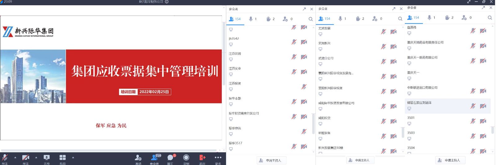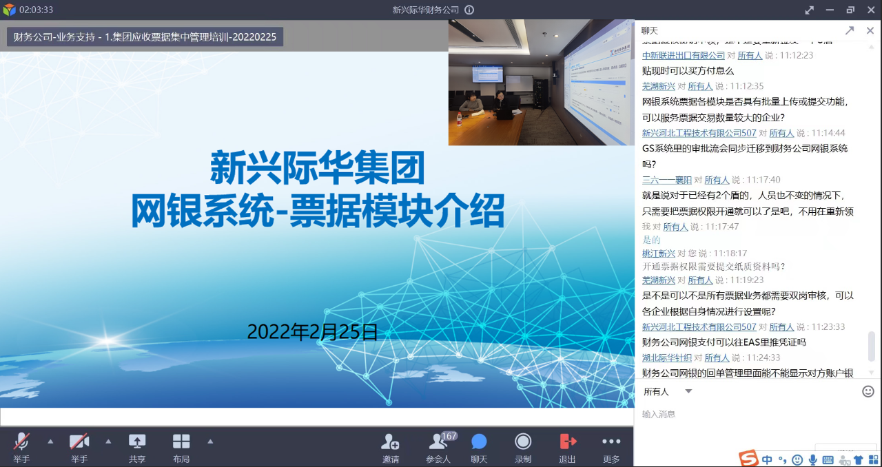 为加快推进司库体系建设,进一步加强和规范所属企业电子商业汇票管理,防范票据业务风险,2022年2月25日,新兴际华集团财务有限公司面向集团成员单位召开全系统票据集中管理专题培训。全系统共计170个单位300余人视频参会。