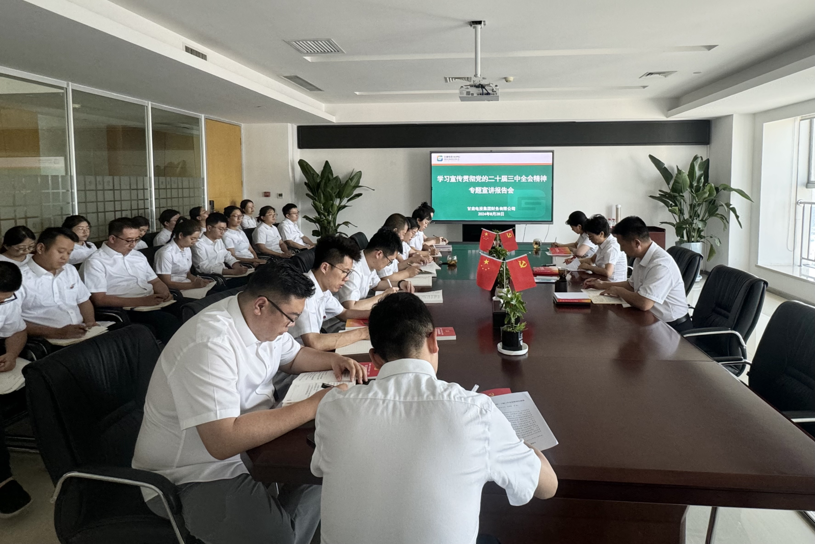 汲取“红色养分”,加强思想锤炼。严格落实“第一议题”制度,两级党组织通过党委会、党委理论学习中心组、党支部“三会一课”和主题党日等载体,综合运用集中学习、专题研讨、辅导讲座、主题宣讲等形式深入学习习近平新时代中国特色社会思想,及时跟进学习习近平总书记最新讲话精神,切实用党的创新理论武装头脑、指导实践、推动工作。以开展党纪学习教育、学习党的二十届三中全会精神、常态化纵深推进“三抓三促”行动为契机,分层分类明确学习重点和工作要求,细化分解各项工作任务,形成班子成员带头学、中层干部深入学、支部书记重点学、全体党员集中学的良好学习氛围。不断拓宽理论学习渠道,引导全体党员充分运用“学习强国”“甘肃党建”“两微一端”等线上学习平台,随时随地跟进学习党的创新理论,做到学习领会全方位、把握理解全覆盖。突出党性教育,不断丰富党建活动载体,通过开展参观甘肃省简牍博物馆、城市规划馆,观看爱国影片、支部联建共建等主题党日活动,充分调动全体党员争先创优、拼搏奉献的信心和决心,持续提升服务集团及成员单位的责任意识和工作能力。