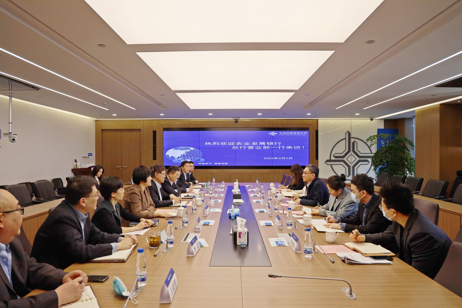 农业发展银行总行营业部副总经理于成霞,客户处、外汇与投资业务处、会计结算处负责人,中交财务公司计划财务部、信贷业务部、结算业务部、金融发展部、办公室等部门负责人及相关人员参加会议。