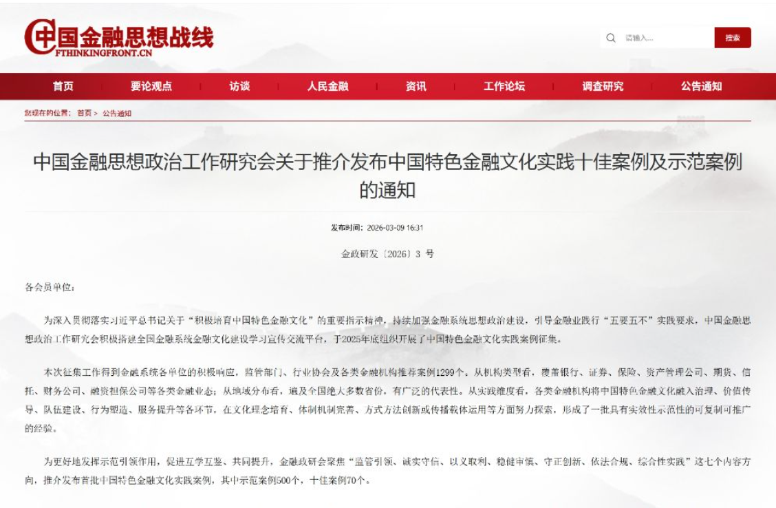 据了解,中国金融思想政治工作研究会成立于1989年,现为国家金融监督管理总局管理的全国性社团组织,现有174家成员单位,覆盖银行、证券、保险等各类金融机构。本次案例征集推介是其发挥行业引领作用、服务金融高质量发展的重要举措。