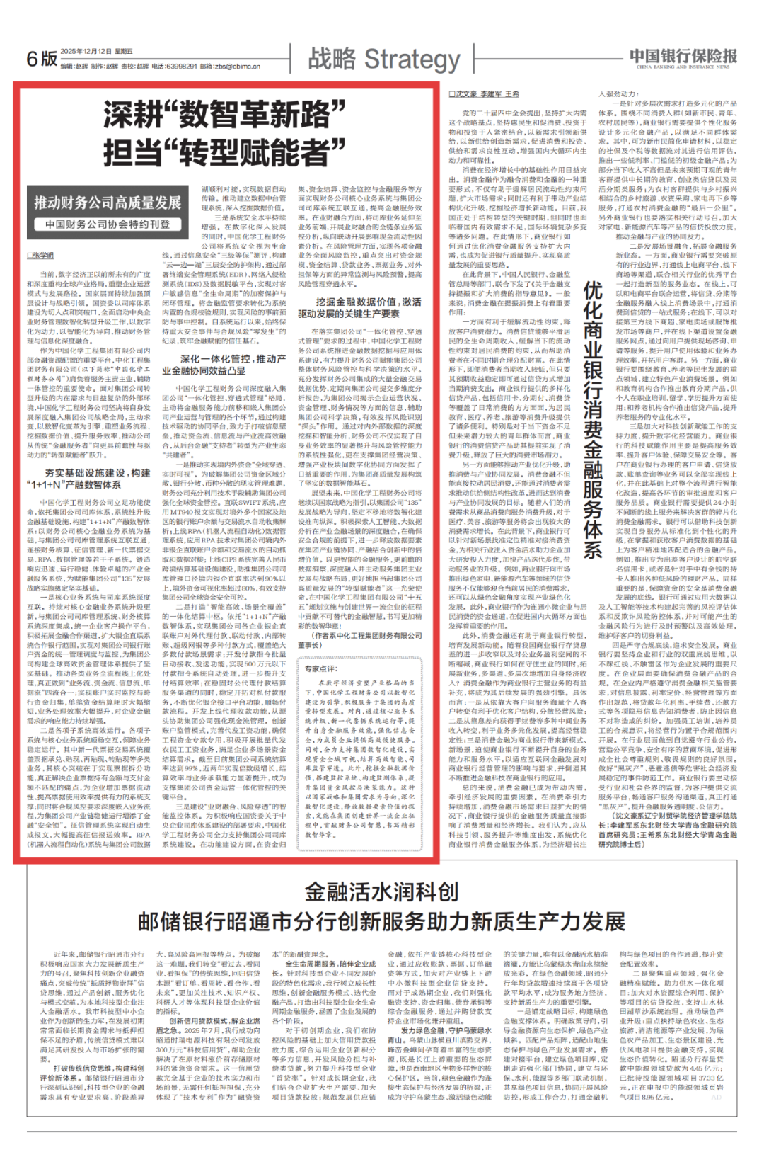 在数字经济重塑产业格局的当下,中国化学工程财务公司以数智化建设为引擎,积极服务于集团的高质量转型发展。对内,通过核心业务系统升级、新一代票据系统运行等,提升自身金融服务效能,强化信息安全,为成员企业提供高效便捷服务。同时,全力支持集团数智化建设,实现资金全域可视、结算高效智能、司库监管穿透。此外,挖掘金融数据价值,搭建监控系统、构建监测体系,提升集团资金风控与决策能力。这种以国家战略和集团需求为导向,深化数智化建设,释放数据要素价值的探索,定能在集团创建世界一流企业征程中,贡献财务公司智慧,书写精彩数智华章。