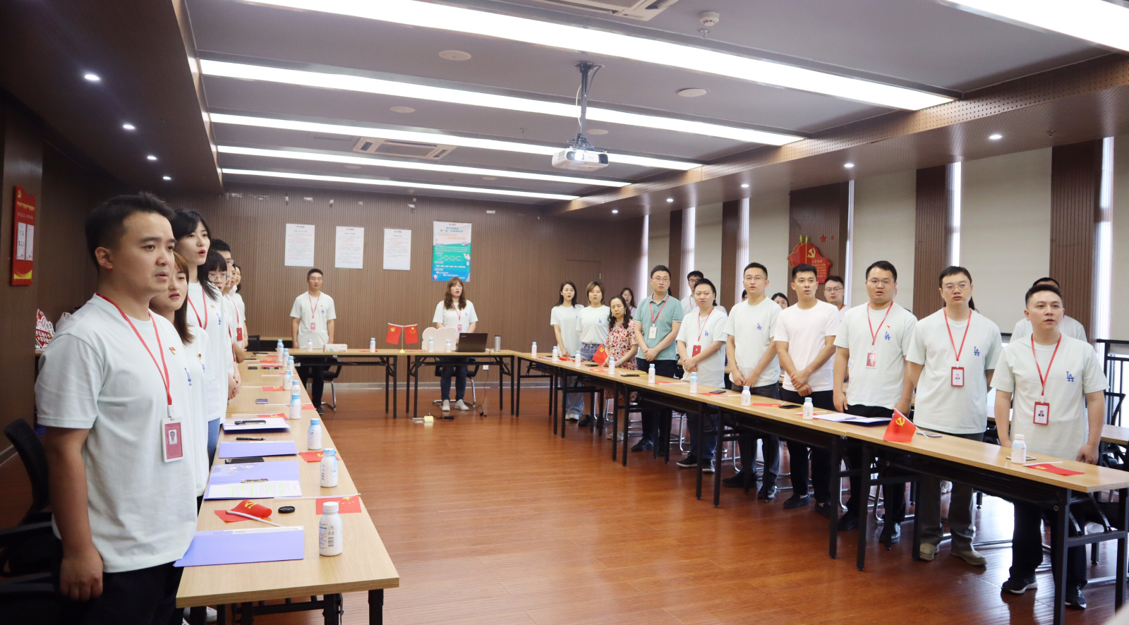 活动伊始,全体党员和员工面向鲜艳的五星红旗,齐声高唱国歌,以嘹亮的歌声,将爱国情怀凝聚升华;以满腔的热情,表达对祖国母亲的热爱。伴随着熟悉的旋律声响起,全体党员和员工热血沸腾、心潮澎湃,庄严、自豪、崇高的感觉从心中油然而生,国歌激昂的旋律、深刻的歌词,不断鼓舞着我们在实现中华民族伟大复兴的征途上永不懈怠、勇往直前。