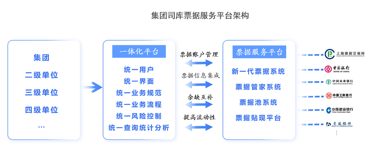 通过新一代票据系统、票交所票据账户主动管理服务及“集票宝”创新产品,与票据交易所、商业银行等机构实