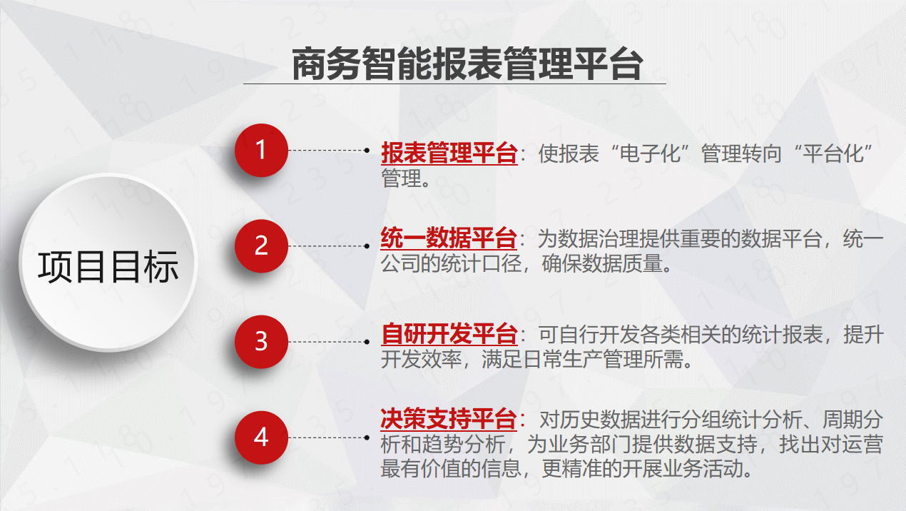 构建商务智能报表管理平台,实现报表管理平台、统一数据平台、自研开发平台、决策支持平台的项目