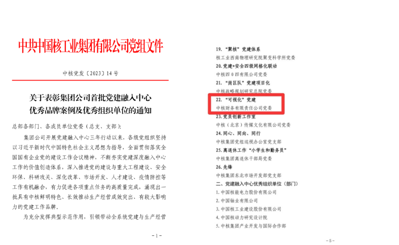近日,中核集团党组印发《关于表彰集团公司首批党建融入中心优秀品牌案例及优秀组织单位的通知》,中