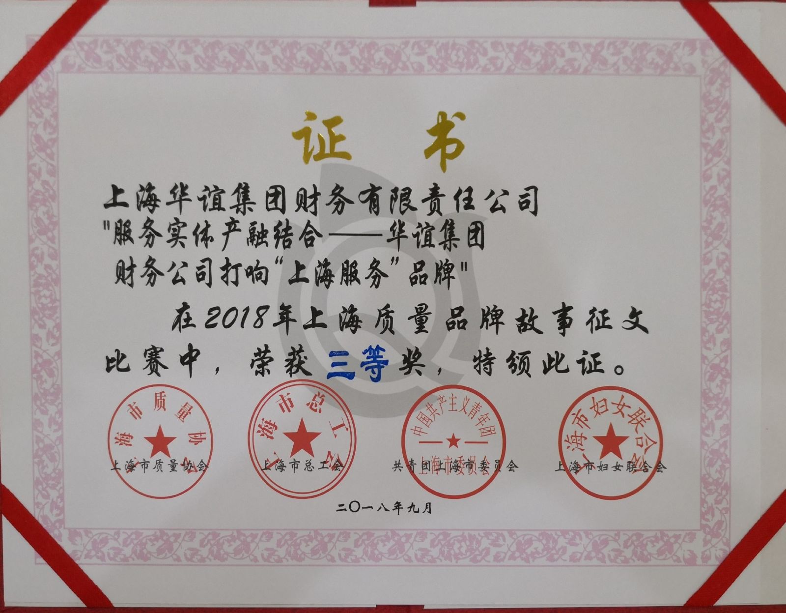 近日,受工业和信息化部委托,中国质量协会联合上海市质量协会、上海市共青团委员会、上海市总工会、上海市妇女联合会共同举办了第六届全国品牌故事大赛上海赛区比赛。此次比赛活动主题为“讲好高质量发展故事、传播新时代品牌强音”,活动形式涵盖演讲、征文、微电影。上海华谊集团财务公司以《服务实体产融结合——打响“上海服务”品牌》一文代表上海华谊集团参加了此次活动,成功入围并最终取得了征文比赛三等奖。