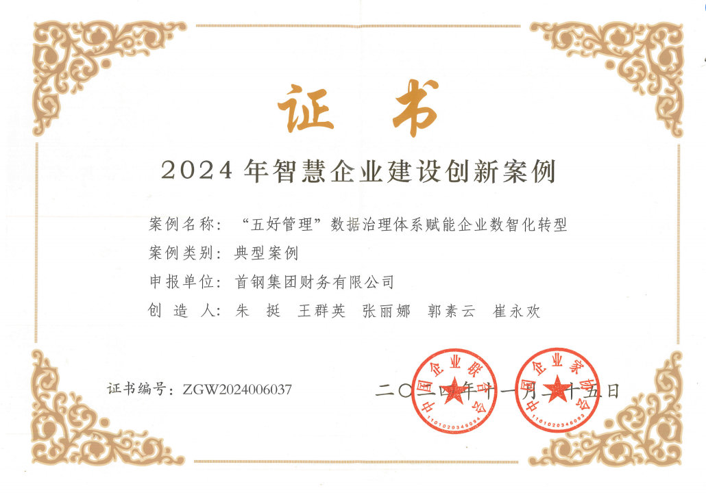 财务公司申报的“‘五好管理’数据治理体系赋能企业数智化转型”荣获2024年智慧企业建设创新案例,这