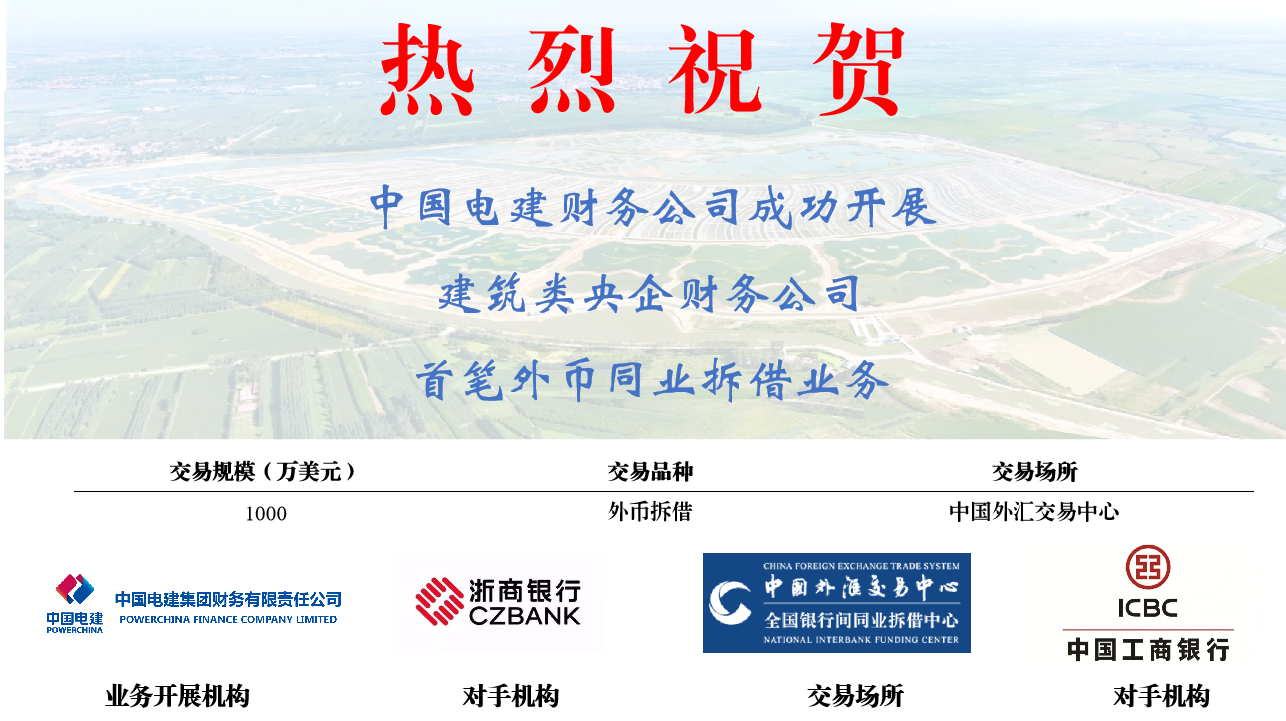 3月29日,电建财务公司通过全国银行间外币交易系统与浙商银行成功开展首笔外币同业拆借业务,融