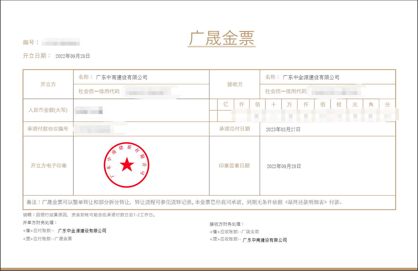 9月28日,广晟集团所属华建集团广东中南建设有限公司通过广晟财务公司产融数字化资金网链平台开出