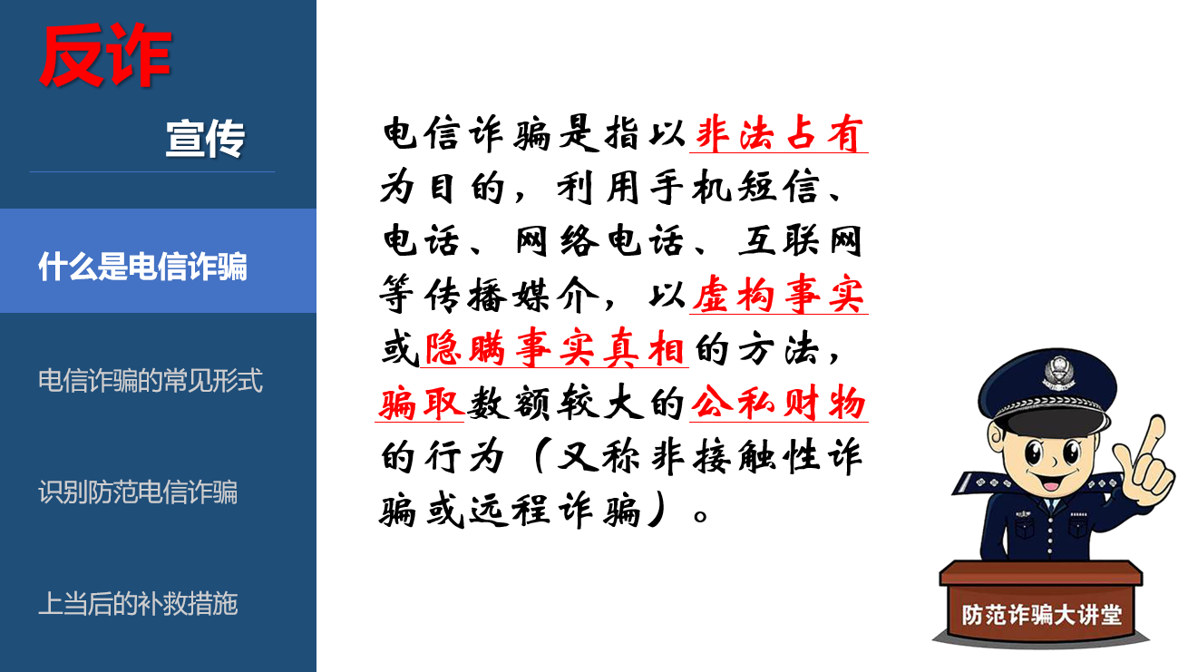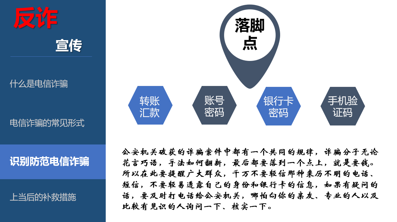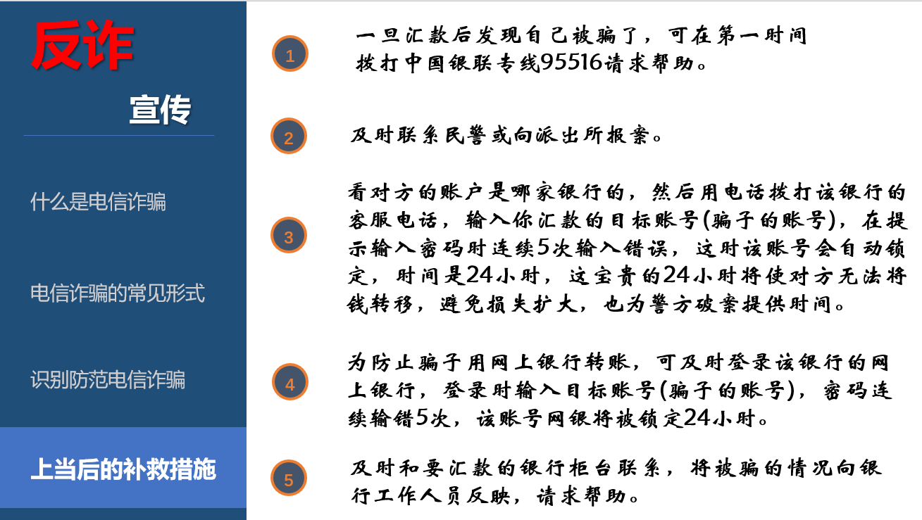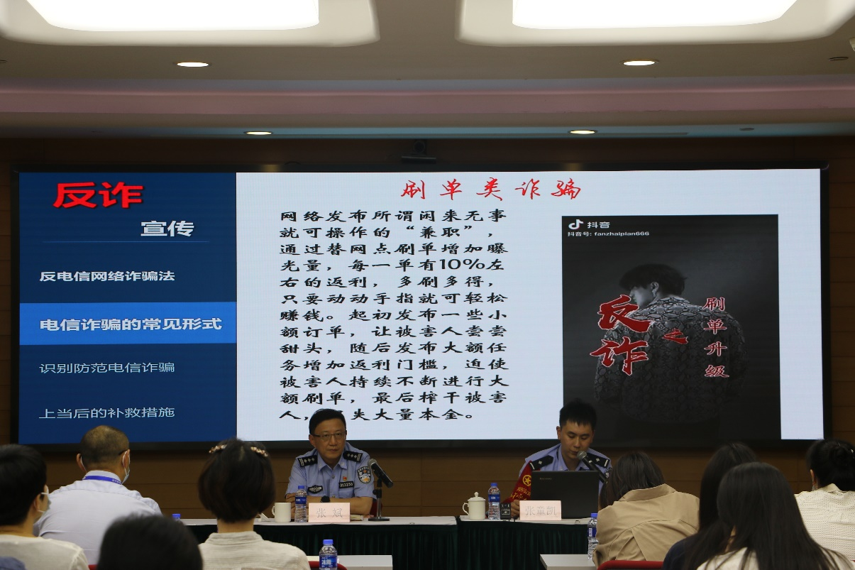 章制度,依纪依规办事;一旦“中招”要及时报警并采取必要措施,尽最大努力减少财产损失。同时,动员大家在