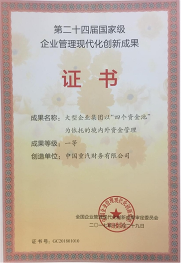 本届评选共收到企业申报成果551项,经高等院校、科研机构、行业协会等有关专家初审、预审,在媒体进行公示,并由全国审委会终审,最终审定一等奖33项,二等奖172项,其中由中国重汽财务有限公司申报的《大型企业集团以“四个资金池”为依托的境内外资金管理》脱颖而出荣获一等奖,此奖项即是中国重汽重组以来在企业管理现代化创新成果中获得的最高奖项,同时也是中国财务公司行业关于企业管理现代化创新的最高奖项。