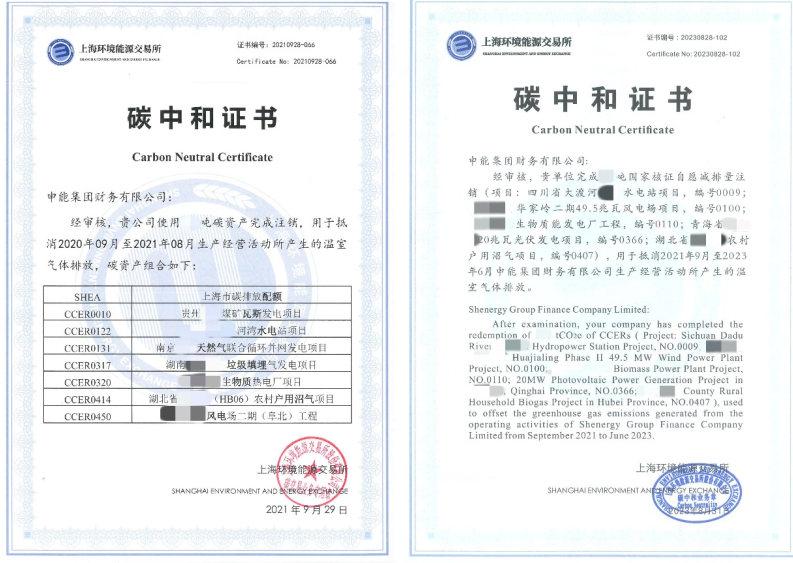 2021年9月,申能财务公司先行先试,使用瓦斯发电、水电、天然气、垃圾填埋、生物质热电、沼
