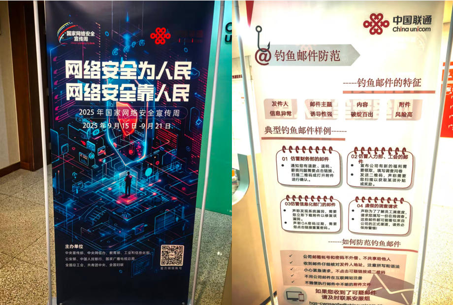 持续加强宣传教育,点亮网络安全知识灯塔。公司制作了网络安全宣传周海报放置醒目位置,重点介绍钓鱼邮件防范内容,从钓鱼邮件的特点、典型案例、如何防范钓鱼邮件等方面进行知识普及。同时,组织全体员工依托“中国联通2025年网络安全宣传月”学习专区,深入学习《中华人民共和国反电信网络诈骗法》《关键信息基础设施安全保护条例》等课程,更深入了解网络安全的重要性,掌握基本的网络安全防护技能。通过组织全员积极参与线上答题——“中国联通2025年网络安全宣传月考试”,从日常办公终端使用、数据保密原则、U盘使用等不同方面,进一步巩固知识学习。