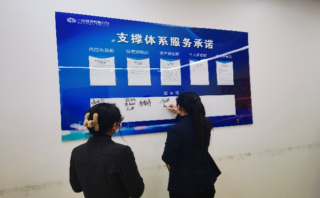 签约环节,首先由风控合规部、经营控制部、资产保全部、个人评审部、法人评审部经理带领部门员工依次宣读本部门《服务承诺书》,随后各部门人员依次在签约栏郑重签署姓名。最后由李小欣总经理总结讲话,并提出工作要求。
