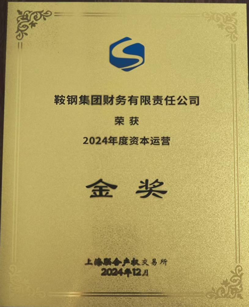 鞍钢集团财务有限公司荣获上海联合产权交易控股有限公司2024年资本运营金奖。该奖项代表上海产权交易所对鞍钢集团财务有限公司2024年度各项国有资产交易工作的高度肯定。