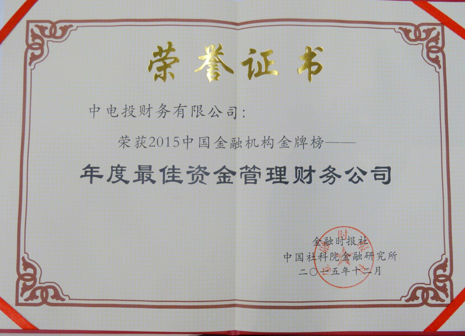 12月18日,由国内主流财经媒体《金融时报》社主办的2015年金融时报年会暨“2015年中国金融机构金牌榜·金龙奖”颁奖盛典在北京金融街威斯汀酒店举办,中电投财务有限公司受邀出席此次年会并荣获“年度最佳资金管理财务公司奖”。