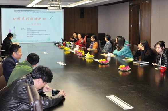 2015年12月3日,航天科工财务公司武汉分公司工会,在分公司会议室举办了一年一度的优雅系列活动——冬季养生讲座,并邀请武汉市惠医堂经络养生连锁机构总经理邓凯云女士作为本次讲座主讲嘉宾,为员工普及冬季养生和一天十二时辰的养生保健知识。