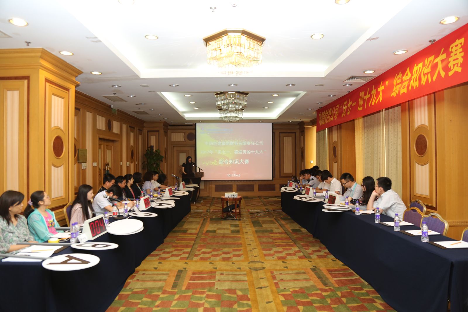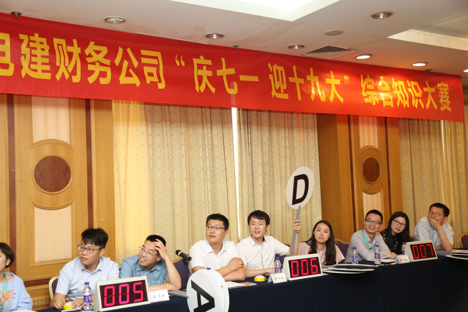 6月29日,中国电建财务公司举办了“庆七一,喜迎党的十九大”综合知识大赛。中国电建财务公司党委书记沈国华、纪委书记杨志强、副总经理龚健莅临现场,并邀请中国电建集团公司团委副书记刘新建到场指导,观看了选手们精彩比赛。