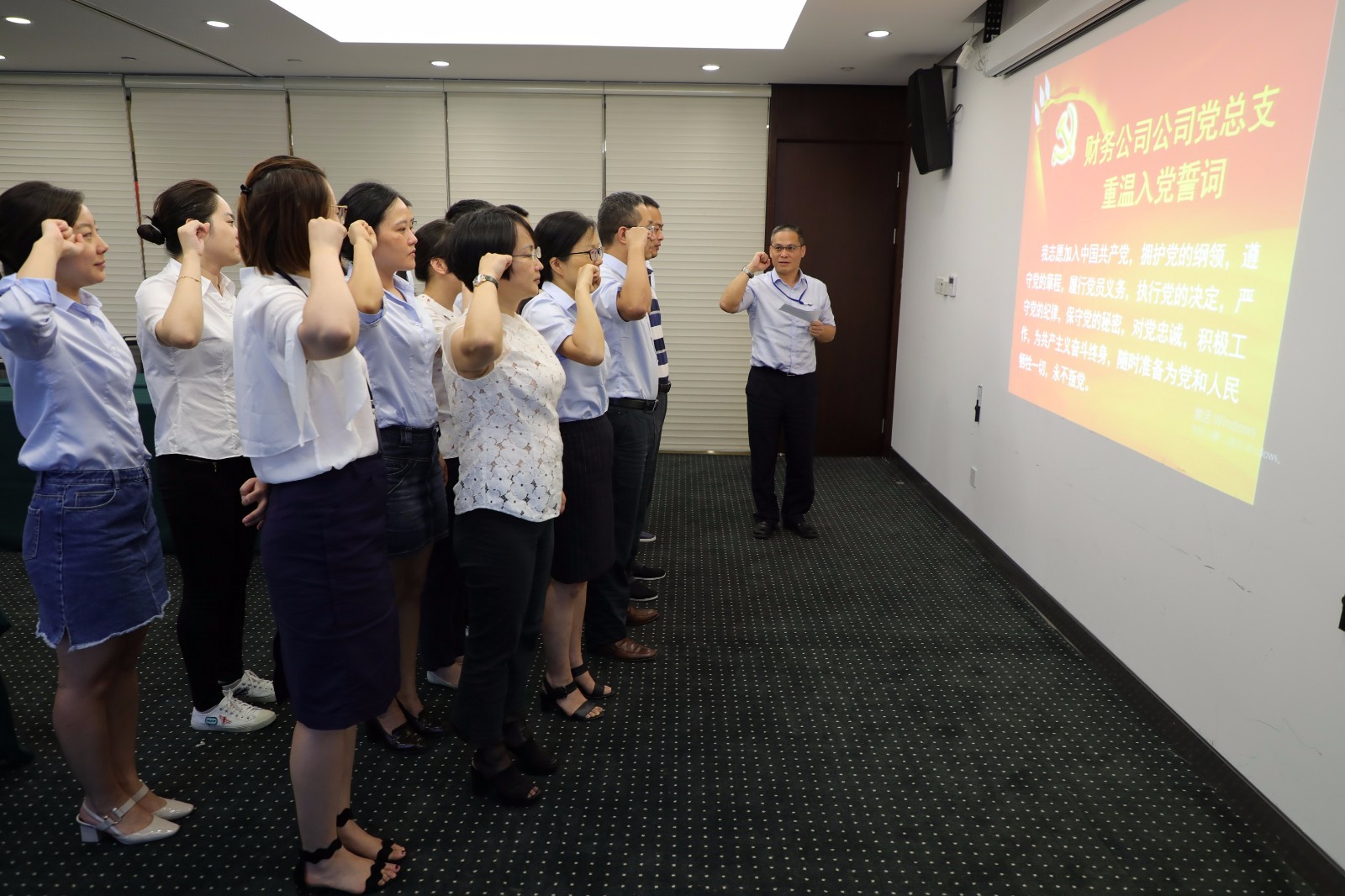 面对党旗,公司全体党员宣读誓词:“我志愿加入中国共产党,拥护党的纲领,遵守党的章程……”。党员们举起右拳,在鲜红的党旗下庄严宣誓,立下自己对党忠诚的誓言,表达了为党的事业奋斗终身的决心和愿望。