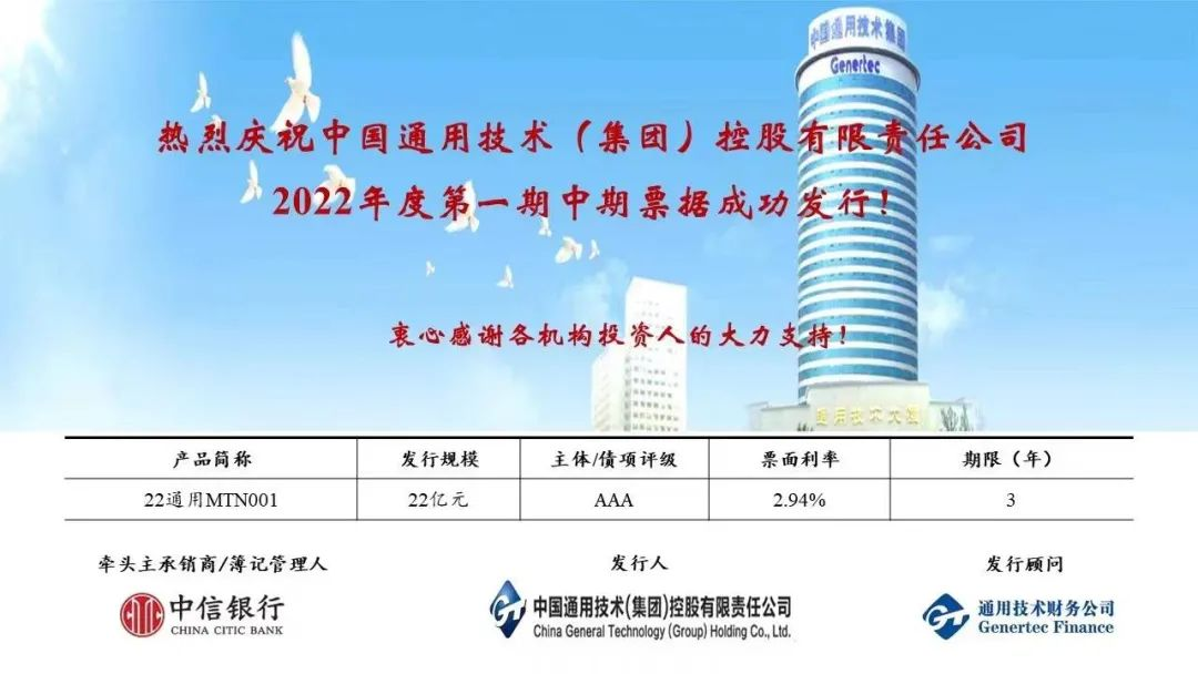 近年来,通用技术财务公司作为财务顾问,主动担当、积极作为,助力集团多支债券发行,2022年1月18日,年内开局完成首支中期票据发行工作,票面利率处于同时期发行的较低水平。