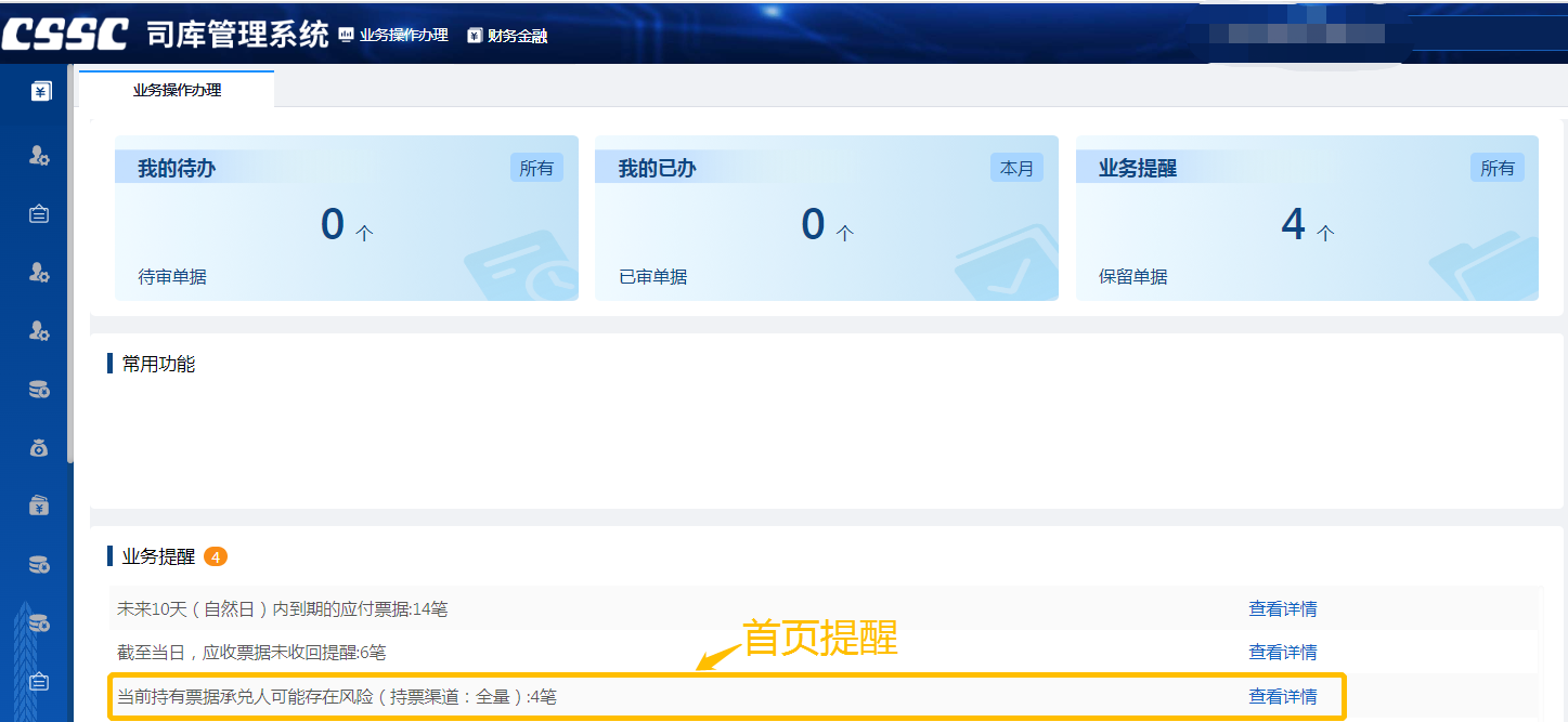 客户单位司库平台登录首页将予以提醒。客户单位可通过点击“查看详情”准确查询票据信息、持票渠道以及该票据承