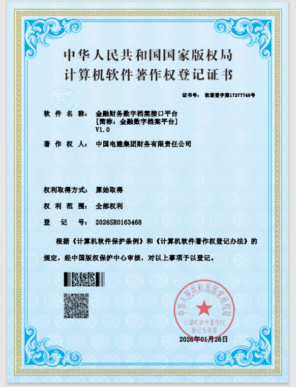 近日,电建财务公司数字档案馆系统顺利通过国家版权局审核认定,成功获得计算机软件著作权登记证书。该证书的取得,标志着公司在数字档案管理领域的自主创新能力与技术研发水平获得国家权威认可,为集团金融板块数字化转型再添重要技术成果。