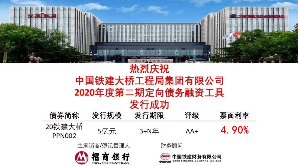 继日前助力中国铁建大桥工程局集团有限公司(简称“大桥局”)成功发行今年以来全国首单永续类定向债务融资工具(简称“PPN”)后,8月14日,中国铁建财务公司作为财务顾问再次“操盘”,成功助力大桥局在银行间市场发行2020年度第二期PPN。该笔债券期限为3+N,发行规模5亿元,票面利率4.9%,发行利率创近期同类型可比债券最低记录。